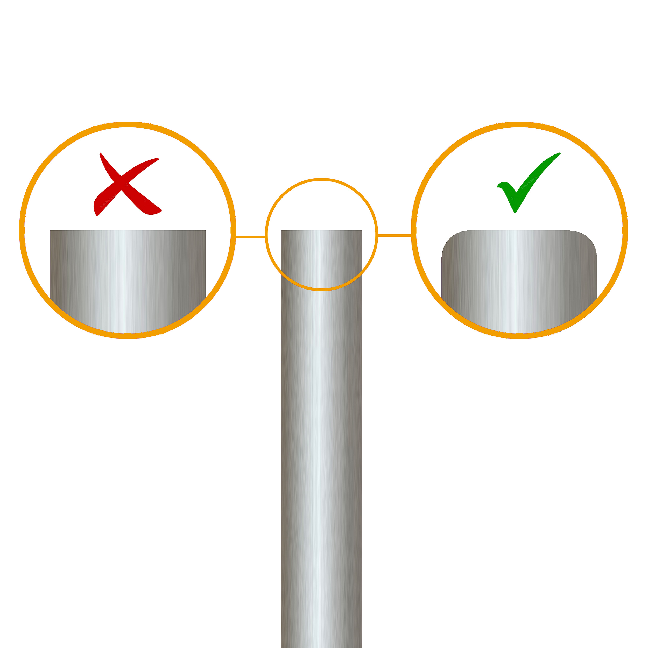 Los extremos de las aristas, se recomienda que estén redondeadas, especialmente las metálicas, para evitar que puedan dañar los vértices.